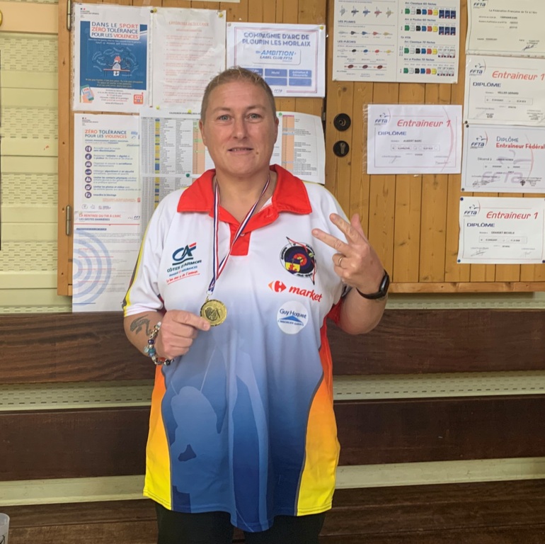 Josiane Lecomte, seule de notre Compagnie à Plourin lès Morlaix, remporte la première place en arc à poulies. Catégorie S2. BRAVO !